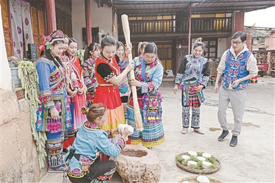 村民在迤沙拉村廣場(chǎng)上打糍粑。石磊 攝