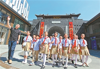 7月30日,江蘇省徐州市九龍湖小學(xué)開展“七彩的夏日·探尋歷史文脈”主題活動,組織學(xué)生游覽徐州歷史文脈——“彭城七里”,引導(dǎo)學(xué)生了解家鄉(xiāng)歷史,感受文脈傳承。圖為學(xué)生們參觀文廟街區(qū)。蒯創(chuàng) 攝