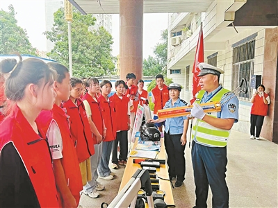 8月1日,山東省莘縣交警大隊聯(lián)合同城一家公益協(xié)會組織30余名青少年志愿者走進警營,開展“七彩假期,文明交通伴我行”文明實踐志愿服務(wù)活動?;顒又?,民警介紹了酒精測試儀、執(zhí)法記錄儀等警用裝備的作用;帶領(lǐng)同學(xué)們走進有“最強大腦”之稱的122交通指揮中心感受“情指行”一體化智能交通系統(tǒng)的威力;結(jié)合典型交通事故案例、重點交通違法行為等講解如何安全行走、如何安全乘車、如何安全騎車,引導(dǎo)同學(xué)們自覺遵守文明交通法規(guī),做到“知危險、會避險”。圖為青少年志愿者聽民警介紹警用裝備。馮永華 攝