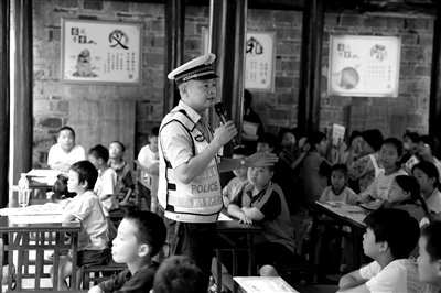 8月1日,貴州省天柱縣公安局交警大隊(duì)民警來到渡馬鎮(zhèn)龍盤村“家風(fēng)學(xué)堂”,為參加暑期班的孩子們上了一堂交通安全課。民警通過發(fā)放宣傳資料,講解交通安全知識等方式告訴孩子們假期應(yīng)該注意的交通安全事項(xiàng),以及在步行、騎車、乘車時應(yīng)該遵守的交通規(guī)則,提醒大家在假期出行,一定要自覺遵守交通規(guī)則,文明參與交通,堅決杜絕違法交通行為的發(fā)生。圖為民警向孩子們講解暑期安全出行知識。唐光新 攝