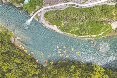 暑假期間,福建省寧德市壽寧縣犀溪漂流項目迎來旺季,各地游客紛紛前來體驗皮筏漂流、高空漂流和游泳戲水,同時帶動鄉(xiāng)村民宿、農家樂等旅游業(yè)態(tài)發(fā)展。圖為8月3日,游客在壽寧縣犀溪鎮(zhèn),乘坐皮筏漂流,在山谷溪流間樂享清涼。謝貴明 攝