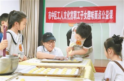 暑假期間,山東省棗莊市市中區(qū)工人文化宮開辦愛心托管班,開設暑期乒乓球、手工制作等課程,解決職工子女假期“看護難”的問題。圖為8月6日,棗莊市市中區(qū)工人文化宮舉行“職工子女趣味面點公益課堂”,小朋友們在面點師現場教學中體驗傳統(tǒng)面點制作的樂趣。