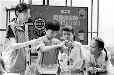 8月13日,全國(guó)生態(tài)日臨近,福建省福州市鼓樓區(qū)安泰街道于山社區(qū)舉辦“探索水奧秘 守護(hù)藍(lán)色寶藏”科普夏令營(yíng)研學(xué)活動(dòng),來(lái)自閩江學(xué)院的大學(xué)生志愿者通過(guò)講解水知識(shí)、做污水處理實(shí)驗(yàn)等,讓孩子們?cè)诨?dòng)探究中提高愛(ài)護(hù)水環(huán)境意識(shí)。圖為大學(xué)生志愿者在指導(dǎo)孩子們進(jìn)行污水處理小實(shí)驗(yàn)。謝貴明 攝