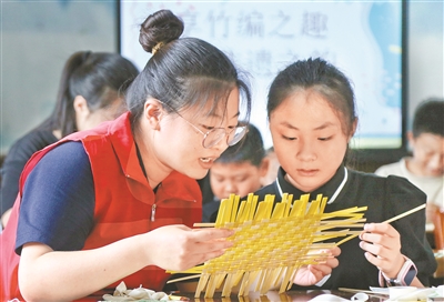 8月12日,江蘇省海安市墩頭鎮(zhèn)新時(shí)代文明實(shí)踐所、墩頭鎮(zhèn)婦聯(lián)聯(lián)合開(kāi)展“享竹編之趣 賞非遺之韻”手工活動(dòng),通過(guò)親子共做和志愿者指導(dǎo)等環(huán)節(jié),引導(dǎo)孩子學(xué)習(xí)竹編技藝,感受竹編魅力,樂(lè)享假期。圖為當(dāng)日,志愿者在指導(dǎo)小朋友制作竹編扇。 周強(qiáng) 攝
