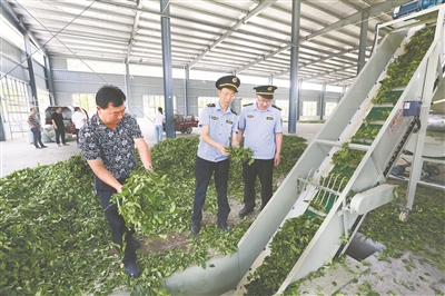 湖北省竹山縣興秦茶業(yè)有限公司大葉茶加工出口項(xiàng)目投資1500萬(wàn)元,每日可加工鮮葉1萬(wàn)公斤,生產(chǎn)干茶3000公斤,可帶動(dòng)全鎮(zhèn)2000余戶茶農(nóng)增收致富。為使公司盡快投產(chǎn),竹山縣市場(chǎng)監(jiān)管局秦古市場(chǎng)監(jiān)管所主動(dòng)服務(wù),從廠房設(shè)計(jì)到取得生產(chǎn)許可證,再到產(chǎn)品加工、外包裝設(shè)計(jì),該所全程參與服務(wù)。目前,該大葉茶加工出口項(xiàng)目已建成投產(chǎn),進(jìn)一步促進(jìn)茶產(chǎn)業(yè)質(zhì)量效益同步提升。圖為8月15日,竹山縣市場(chǎng)監(jiān)管局秦古市場(chǎng)監(jiān)管所工作人員,走進(jìn)興秦茶業(yè)有限公司,了解公司生產(chǎn)經(jīng)營(yíng)情況。朱本雙 陳文 攝