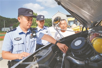 秋季開學(xué)臨近,安徽省安慶市懷寧縣公安局雷埠派出所組織民警開展校車安全檢查?;顒?dòng)中,民警對校車信息資料、司機(jī)駕駛資格、安全性能和隨車配備的安全應(yīng)急器材設(shè)備等進(jìn)行了檢查,確保學(xué)生乘車安全。圖為檢查現(xiàn)場。檀志揚(yáng) 殷俊 攝