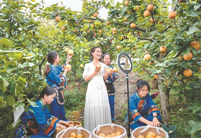 近年來,貴州省天柱縣積極開展直播人才培育,通過開展電商技能培訓(xùn)、助農(nóng)公益活動(dòng)等,推動(dòng)黔貨出山助農(nóng)增收。圖為近日,當(dāng)?shù)刂r(nóng)志愿者在天柱縣高釀鎮(zhèn)金秋梨基地開展直播助農(nóng)公益活動(dòng)。