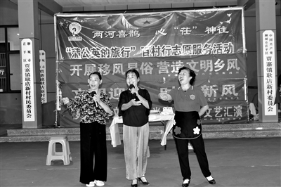 9月4日晚,在山東省聊城市茌平區(qū)賈寨鎮(zhèn)耿店新村文化廣場,主題為“兩河喜鵲心‘茌’神往”的移風易俗文明新風尚基層文藝宣傳匯演舉行,賈寨鎮(zhèn)雙河文化演藝隊、鄉(xiāng)村放歌賈寨分團的文藝志愿者,自編自導自演了關于抵制天價彩禮、拒絕惡俗婚鬧、提倡喪事從簡等題材的小戲、小品、山東快書等,為現(xiàn)場觀眾送去精彩的文化食糧。圖為賈寨鎮(zhèn)文明迎親隊的隊員們在表演小戲《退彩禮》。趙玉國 攝