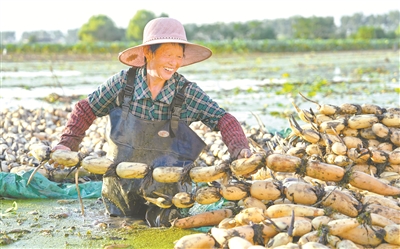 連日來,江蘇省海安市墩頭鎮(zhèn)新舍村種植的蓮藕迎來成熟收獲季,當?shù)嘏恨r(nóng)抓緊采收,供應(yīng)市場。圖為9月13日,墩頭鎮(zhèn)新舍村藕農(nóng)忙著采收淺水藕。周強 攝