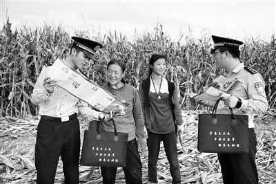 9月18日,甘肅省平?jīng)鍪泄簿轴轻挤志职姿沙鏊e極組織民警走村串戶,開展普法到基層、送法進(jìn)田間活動(dòng)。民警采取靈活多樣、貼近群眾的“流動(dòng)式”普法方式,利用農(nóng)民收割休息間隙,把農(nóng)村道路交通安全宣傳和涉農(nóng)領(lǐng)域反詐騙宣傳送到田間地頭、農(nóng)戶家中,用樸實(shí)易懂的語言,為群眾送去與生產(chǎn)生活息息相關(guān)的法律知識(shí)。圖為民警正在向群眾宣傳法律知識(shí)。鄭兵 攝