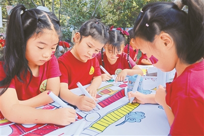 9月25日,江蘇省徐州市豐縣華山鎮(zhèn)彤艷幼兒園開展了“童心迎國慶”主題活動,通過童聲唱國歌、巧手繪長卷、看圖識美景等系列活動,喜迎新中國75周年華誕。圖為孩子們用七彩畫筆描繪心中的絢麗中國。 高榮光 攝