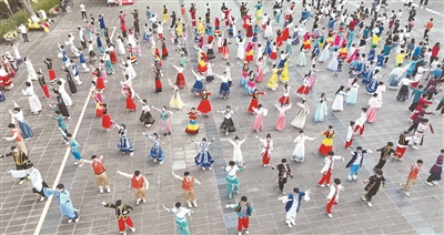 近日,重慶科創(chuàng)職業(yè)學(xué)院舉辦“同心共筑中國夢,攜手共繪民族情”主題活動,數(shù)百名學(xué)生身著各民族傳統(tǒng)服飾,隨著《我和我的祖國》的旋律翩翩起舞,用飽滿的熱情和激昂的歌聲,表達(dá)對祖國的熱愛。圖為活動現(xiàn)場。陳仕川 攝