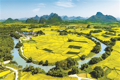 近年來,廣西桂林市臨桂區(qū)采取積極措施完善耕地保護(hù)制度,確保糧食播種面積穩(wěn)定,大力推廣優(yōu)質(zhì)稻谷種植,促進(jìn)農(nóng)業(yè)豐產(chǎn)、農(nóng)民增收。圖為近日,即將收割的臨桂區(qū)四塘鎮(zhèn)大灣村的千畝連片水稻田。黃勝林 攝
