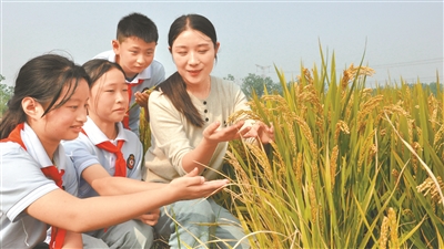 為迎接世界糧食日,近日,江蘇省連云港市東??h牛山街道小學(xué)組織學(xué)生來到田間地頭觀察糧食生長、金黃成熟的景象,教育學(xué)生關(guān)心糧食、珍惜糧食。圖為老師向?qū)W生介紹水稻相關(guān)知識。張玲 攝
