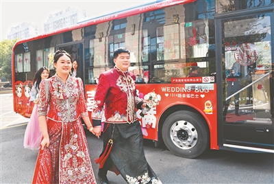 為倡導(dǎo)文明節(jié)儉婚俗新風(fēng),山東省棗莊市山亭交發(fā)集團(tuán)創(chuàng)新推出520路、1314路公交婚車專線,為新人們提供浪漫而難忘的婚禮體驗(yàn)。據(jù)了解,自2023年10月推出婚禮公交服務(wù)以來(lái),因其形式新穎、費(fèi)用節(jié)儉、熱鬧喜慶、低碳環(huán)保等,受到年輕人的青睞。圖為棗莊市山亭區(qū)水泉鎮(zhèn)鄭莊村的一對(duì)新人走下公交婚車,前往婚禮現(xiàn)場(chǎng)。李宗憲 攝