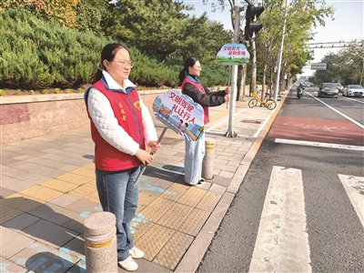 石景山區(qū)志愿者在早晚高峰時(shí)段持續(xù)開(kāi)展文明交通志愿服務(wù)。