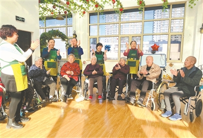 平陽路街道親賢社區(qū)志愿者帶領(lǐng)老人們做健手操。