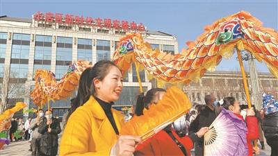 群眾在小店區(qū)新時代文明實踐中心前的廣場進行舞龍表演。