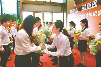 公司黨委班子成員在2024年榮譽表彰典禮上為先進員工獻花。