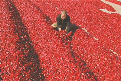 眼下正值辣椒豐收季,內(nèi)蒙古自治區(qū)通遼市奈曼旗白音他拉蘇木辣椒喜獲豐收,田間地頭隨處可見農(nóng)戶們采收辣椒的忙碌身影,一派喜人的豐收景象。圖為近日,白音他拉蘇木哲日都村村民在庭院晾曬紅干椒。