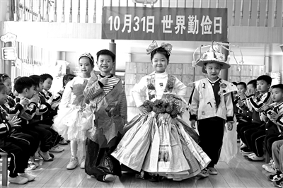 10月31日是“世界勤儉日”。當(dāng)日,山東省棗莊市市中區(qū)絲雨幼兒園開展了“變廢為寶倡勤儉”主題教育活動(dòng),小朋友們身著由報(bào)紙、塑料袋等廢舊物品制作的“環(huán)保時(shí)裝”走秀,引導(dǎo)他們從小養(yǎng)成勤儉節(jié)約的好習(xí)慣。圖為小朋友們正在展示用廢舊物品制作的“環(huán)保服裝”。孫中喆 攝