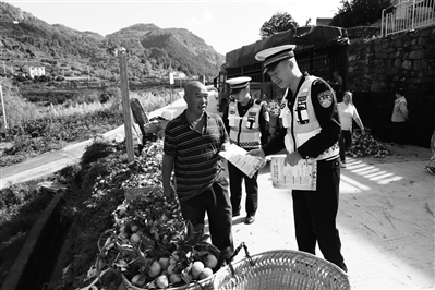 11月1日,貴州省余慶縣公安局交警大隊(duì)宣傳民輔警走進(jìn)轄區(qū)白泥鎮(zhèn)滿溪村鄉(xiāng)村道路蜜橘交易市場(chǎng)開(kāi)展交通安全宣傳教育活動(dòng),為果農(nóng)果商保駕護(hù)航,切實(shí)做到“豐收”“安全”兩不誤。圖為活動(dòng)現(xiàn)場(chǎng)。羅勝謨 攝