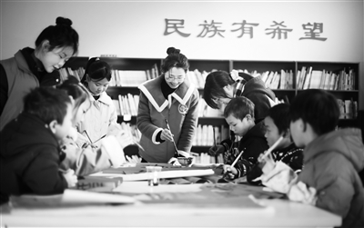 寒假以來(lái),貴州省黔西市雨朵鎮(zhèn)婦聯(lián)、團(tuán)委,利用各村(社區(qū))新時(shí)代文明實(shí)踐站,開(kāi)設(shè)寒假公益托管班,設(shè)置體育運(yùn)動(dòng)、閱讀指導(dǎo)、勞動(dòng)實(shí)踐、游戲等課程,在解除家長(zhǎng)后顧之憂的同時(shí),帶領(lǐng)孩子們度過(guò)快樂(lè)、安全的寒假。圖為1月21日,雨朵鎮(zhèn)雨明社區(qū)新時(shí)代文明實(shí)踐站的公益托管班里,志愿者指導(dǎo)小朋友練習(xí)書(shū)法。周訓(xùn)超 攝