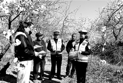 連日來(lái),山東省棗莊市嶧城區(qū)陰平鎮(zhèn)的萬(wàn)畝杏花競(jìng)相綻放,引來(lái)眾多游客前來(lái)觀賞。棗莊市公安局嶧城分局交警大隊(duì)打造“花海警務(wù)”,組織多個(gè)交通安全宣傳小分隊(duì),走進(jìn)杏花園開(kāi)展交通安全宣傳,為群眾賞花游玩保駕護(hù)航。圖為3月18日,民輔警在杏花園里向游客宣傳交通安全知識(shí)。季龍 攝