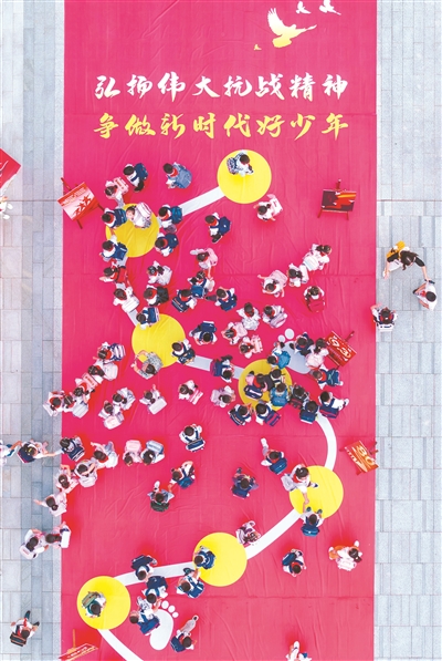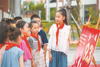 江蘇省海安高新區(qū)實驗小學(xué)將愛國主義教育融入“開學(xué)第一課”,通過抗戰(zhàn)海報展、主題班會等形式,引導(dǎo)學(xué)生銘記歷史、緬懷先烈,傳承弘揚偉大抗戰(zhàn)精神。圖為9月1日,學(xué)生在校園內(nèi)參觀“弘揚偉大抗戰(zhàn)精神”海報展。