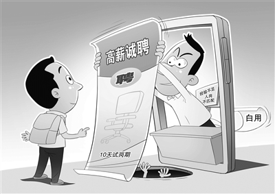 據(jù)媒體報(bào)道,近年來,一些企業(yè)在招聘時(shí)會(huì)設(shè)置3天至10天的試崗期,臨近試崗期結(jié)束,便以“經(jīng)驗(yàn)不足”“人崗不匹配”等理由辭退勞動(dòng)者,并拒絕支付試崗期工資。由于未簽訂勞動(dòng)合同,勞動(dòng)者維護(hù)自身權(quán)益成為難題。有專家認(rèn)為,“無薪試崗”不僅侵害勞動(dòng)者權(quán)益,還會(huì)破壞市場競爭的公平,有關(guān)方面應(yīng)加大執(zhí)法和處罰力度。王琪 圖