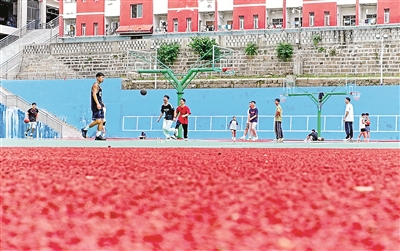新學期,四川省廣元市劍閣縣劍州中學的學生們在課余時間來到操場上進行體育鍛煉,樂享大課間歡樂時光。近年來,劍州中學充分利用廣安市的幫扶資金,對校園籃球場、足球場、田徑場等基礎(chǔ)設(shè)施進行升級,為師生開展體育運動創(chuàng)造良好的條件。圖為學生在改建后的操場上打籃球。游青 董安軍 攝