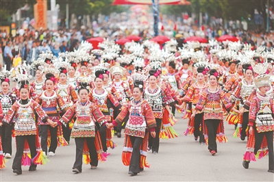 9月20日,第三屆中國非物質(zhì)文化遺產(chǎn)保護(hù)年會暨第四屆丹寨非遺周非遺巡游展演,在貴州省黔東南苗族侗族自治州丹寨縣精彩上演。巡游展演集結(jié)了46個方陣,通過沉浸式體驗與互動,讓市民和游客近距離感受非遺的獨特魅力,展現(xiàn)中華優(yōu)秀傳統(tǒng)文化的多元融合與生機(jī)活力。圖為非遺巡游展演現(xiàn)場。楊武魁 攝