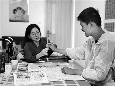 劉曉清(左)在特殊教育學(xué)校指導(dǎo)學(xué)生練習(xí)書法。(受訪者供圖)