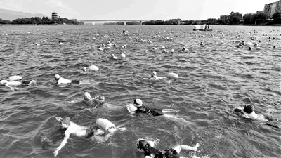 9月20日,廣西壯族自治區(qū)柳州市融安縣舉行主題為“千人游融江·勞模引風(fēng)尚”的千人橫渡融江活動(dòng),游泳愛好者匯聚在江邊,共赴一場(chǎng)“橫渡之約”,一起參加保護(hù)母親河行動(dòng),倡導(dǎo)低碳出行。圖為游泳愛好者正在橫渡融江。譚凱興 攝