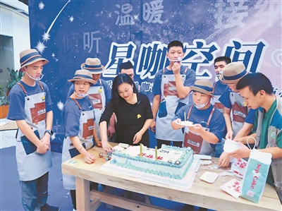 在店里,記者看到了不少用心的設(shè)計(jì):墻面、桌布、杯盞甚至“星員工”的制服,都是統(tǒng)一的星空藍(lán);頭頂飄著云絮般的裝飾,餐桌旁擺著鮮活的綠植,讓咖啡館氛圍松弛又溫馨?!皩挸ǖ沫h(huán)境能減少孩子的情緒波動(dòng),我想讓這里不僅是咖啡店,更是他們?nèi)谌肷鐣?huì)的‘職業(yè)學(xué)?!?。”高芳說。