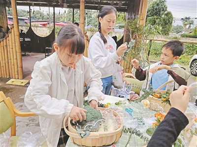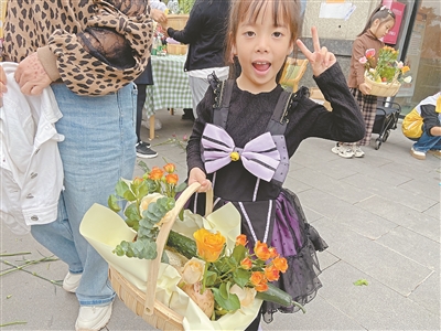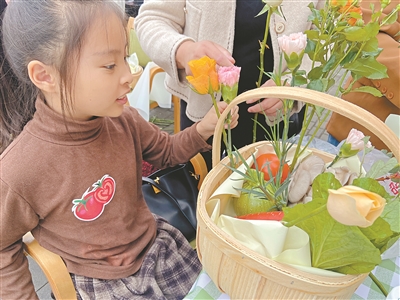 采購(gòu)結(jié)束后,孩子們并沒(méi)有直接回家,而是將親手挑選的蔬菜與鮮花巧妙搭配,制作成一個(gè)個(gè)獨(dú)一無(wú)二的“蔬果花籃”。