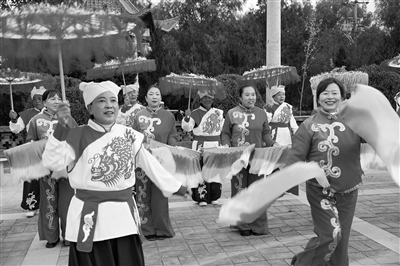 村民在寶塔區(qū)河莊坪趙家岸村扭“傘頭”大秧歌。胡桂芳 攝