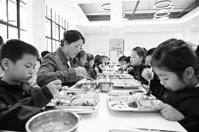 重慶沙坪壩區(qū)樹人和平小學(xué)以校長教師陪餐、師生同隊打飯、家長輪流進校陪餐為切入點,借 “互聯(lián)網(wǎng) + 明廚亮灶” 緊盯食堂 16 個關(guān)鍵環(huán)節(jié),讓陪餐成為校園食安 “監(jiān)督崗” 與家校 “連心橋”,打造家校滿意的 “陽光食堂”。圖為11月4日,樹人和平小學(xué)校長陪學(xué)生們吃午餐。孫凱芳 攝