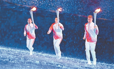 11月9日,火炬手蘇炳添(中)、張家朗(右)、李祎在開(kāi)幕式現(xiàn)場(chǎng)跑向主火炬。新華社記者 肖藝九 攝