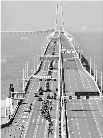 11月8日10時24分,選手通過港珠澳大橋白海豚人工島。 南方日報記者 張由瓊 姚志豪 石磊 蘇韻樺 董天健 關(guān)銘榮 攝