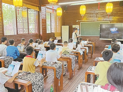 拾級而上,就來到二樓的“清蓮學(xué)堂”。輕輕推開清蓮學(xué)堂的木門,25歲的西河鎮(zhèn)公共事業(yè)服務(wù)中心工作人員阮書旖正在講臺上捧書踱步,掌心輕拂泛黃書頁,悠然吟誦:“予獨(dú)愛蓮之出淤泥而不染,濯清漣而不妖……”一句誦罷,臺下20余名孩童的誦讀聲便齊齊響起。