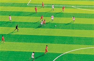 “在2015年建成投用時,學(xué)校并沒有規(guī)劃足球場地?!蹦习秴^(qū)珊瑚魯能小學(xué)校長劉君說,“為此,我們想了很多辦法?!眲⒕榻B,一方面把小場地用好,建設(shè)迷你小球場、籠式小球場、圍擋式足球場等小場地32個;另一方面,重構(gòu)了校園空間,比如利用墻面、屋頂、荒坡等區(qū)域,打造球類訓(xùn)練墻、屋頂足球教室等。學(xué)校還建設(shè)了沙灘足球教室、水上足球場、多媒體智慧足球教室,確保學(xué)生的足球活動和訓(xùn)練不受天氣影響。