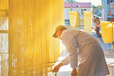 眼下,安徽省安慶市岳西縣手工掛面迎來(lái)產(chǎn)銷旺季,當(dāng)?shù)厥炙嚾苏泳o制作,確保市場(chǎng)供應(yīng)。近年來(lái),岳西縣通過(guò)“公司+合作社+農(nóng)戶”的聯(lián)動(dòng)模式,把岳西豆粑、手工掛面、手工粉絲等非遺項(xiàng)目與傳統(tǒng)手工藝品轉(zhuǎn)化為農(nóng)戶增收致富的特色產(chǎn)業(yè),實(shí)現(xiàn)傳承與發(fā)展雙贏,增加村民收入,助力鄉(xiāng)村全面振興。圖為12月3日,在岳西縣蓮云鄉(xiāng)珠屋村,村民在制作手工掛面。吳均奇 攝