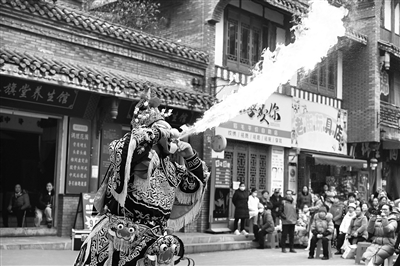 新年臨近,四川省內(nèi)江市東興區(qū)開展川劇惠民巡演活動,讓群眾在家門口樂享戲曲“大餐”,豐富群眾文化生活。圖為12月16日,在內(nèi)江市東興區(qū)東興街道東興社區(qū),川劇演員為群眾表演川劇絕活變臉和吐火。