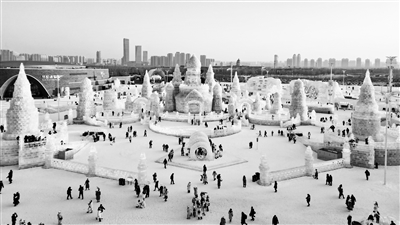 內(nèi)蒙古滿洲里第二十二屆中俄蒙國際冰雪節(jié),匠人用冰鎬精雕258米中式主題雪墻,以“城市起源與發(fā)展”為軸,劃分六大篇章,串聯(lián)起邊陲驛站到國際口岸的百年變遷。園區(qū)深度融合三國建筑、民俗、商貿(mào)元素,構(gòu)建“觀賞+互動+消費(fèi)”三位一體的文化盛宴。