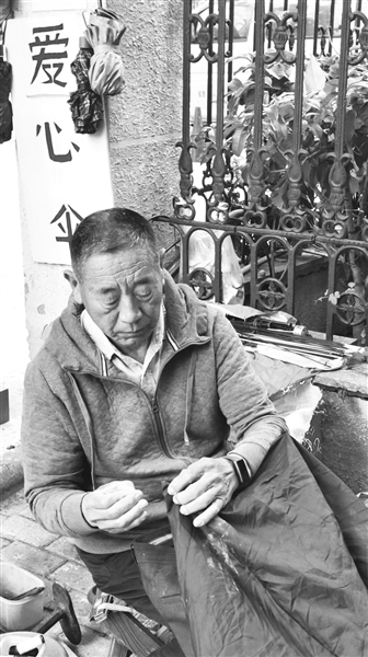 李啟旺是河北保定人,2009年隨兒子來北侖后,就靠修傘修鞋的手藝在這兒安了身。開修理鋪沒多久,他總見路人被突如其來的雨澆得手忙腳亂,可路邊、垃圾桶旁又常見被丟棄的舊傘?!叭恿硕嗫上?,修修還能給大家用?!北е@個想法,他開始撿舊傘、修舊傘,修好了就免費給路人用?!皠傞_始沒招牌,知道的人不多。后來我撿了塊塑料板,自己噴了‘愛心傘’三個字,當(dāng)作招牌掛在這里?!?/FONT>