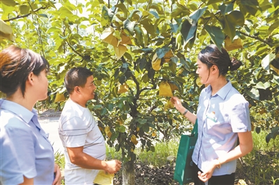 農(nóng)行工作人員了解雪梨種植戶經(jīng)營(yíng)情況。