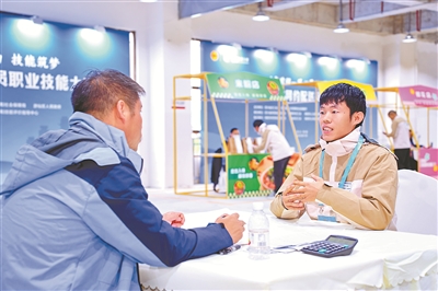 騎手趙明陽(右)參加2025年四川省網(wǎng)約配送員職業(yè)技能大賽,進行現(xiàn)場答辯。(受訪者供圖)