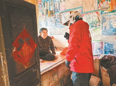 “小鎮(zhèn)外賣”騎手藍(lán)心琪在送完訂單后,幫忙照顧老人。(受訪者供圖)