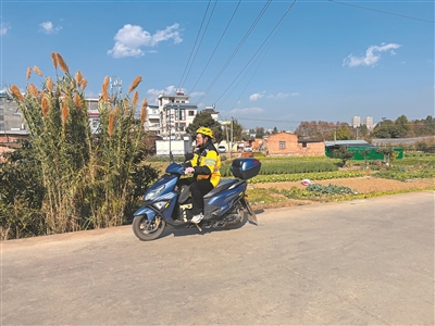騎手李建萍在云南省宜良縣李家村送外賣。 昕悅 攝